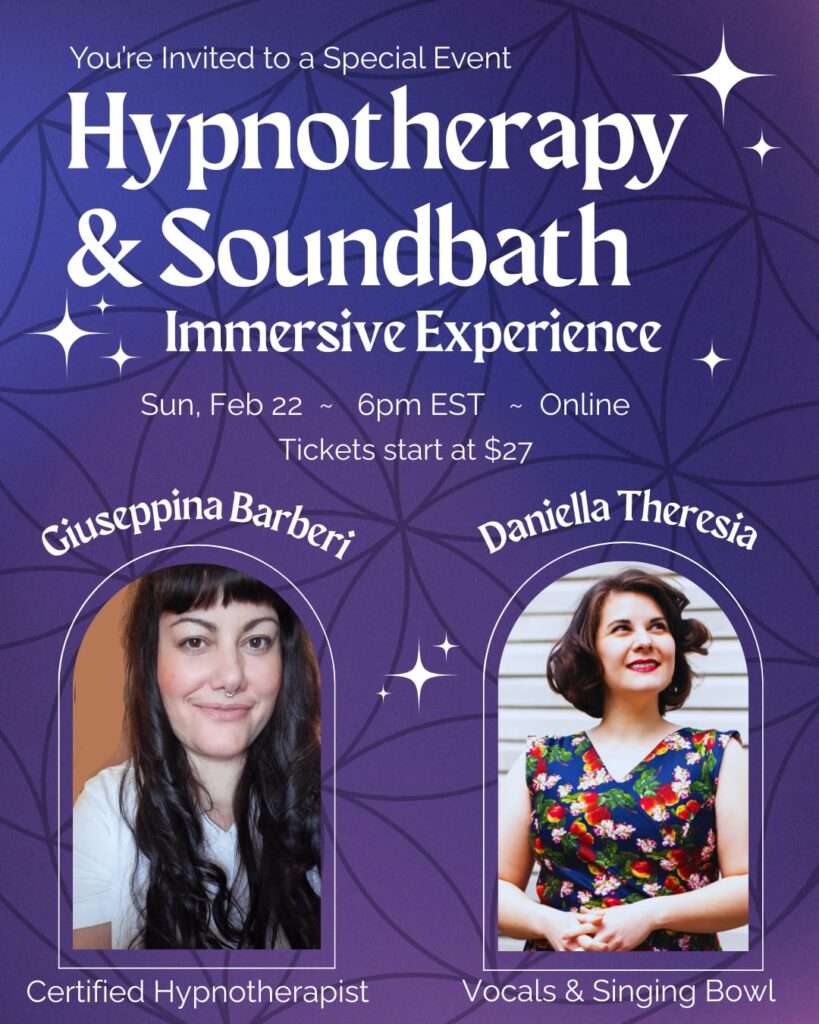 Giuseppina Barberi (Certified Hypnotherapist) will guide you through a 40-minute hypnotherapy session, taking you down to a deep state of relaxation followed by a live soundbath created by Daniella Theresia (Vocals and Singing Bowl) to further integrate and expand on the suggestions heard during the hypnotherapy.
